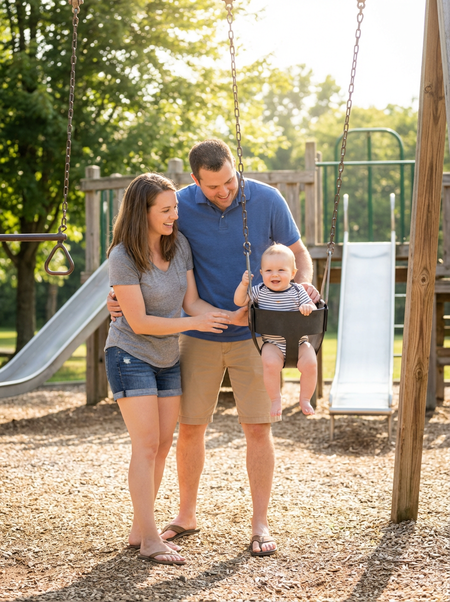 couple with baby at playground, everyone wearing comfortable play clothes, bright sunny day, parents pushing baby on swings and watching them play, active family fun