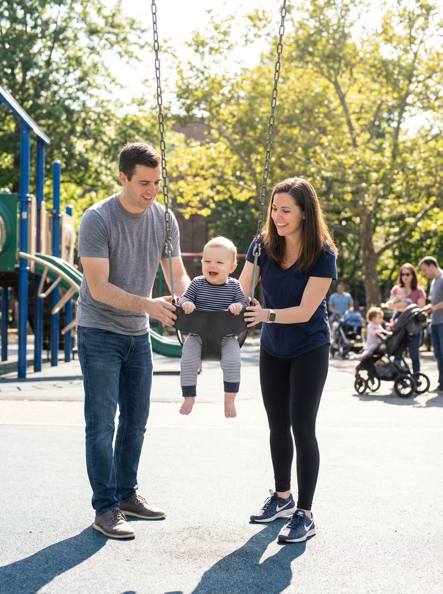 couple with baby at playground, everyone wearing comfortable play clothes, bright sunny day, parents pushing baby on swings and watching them play, active family fun