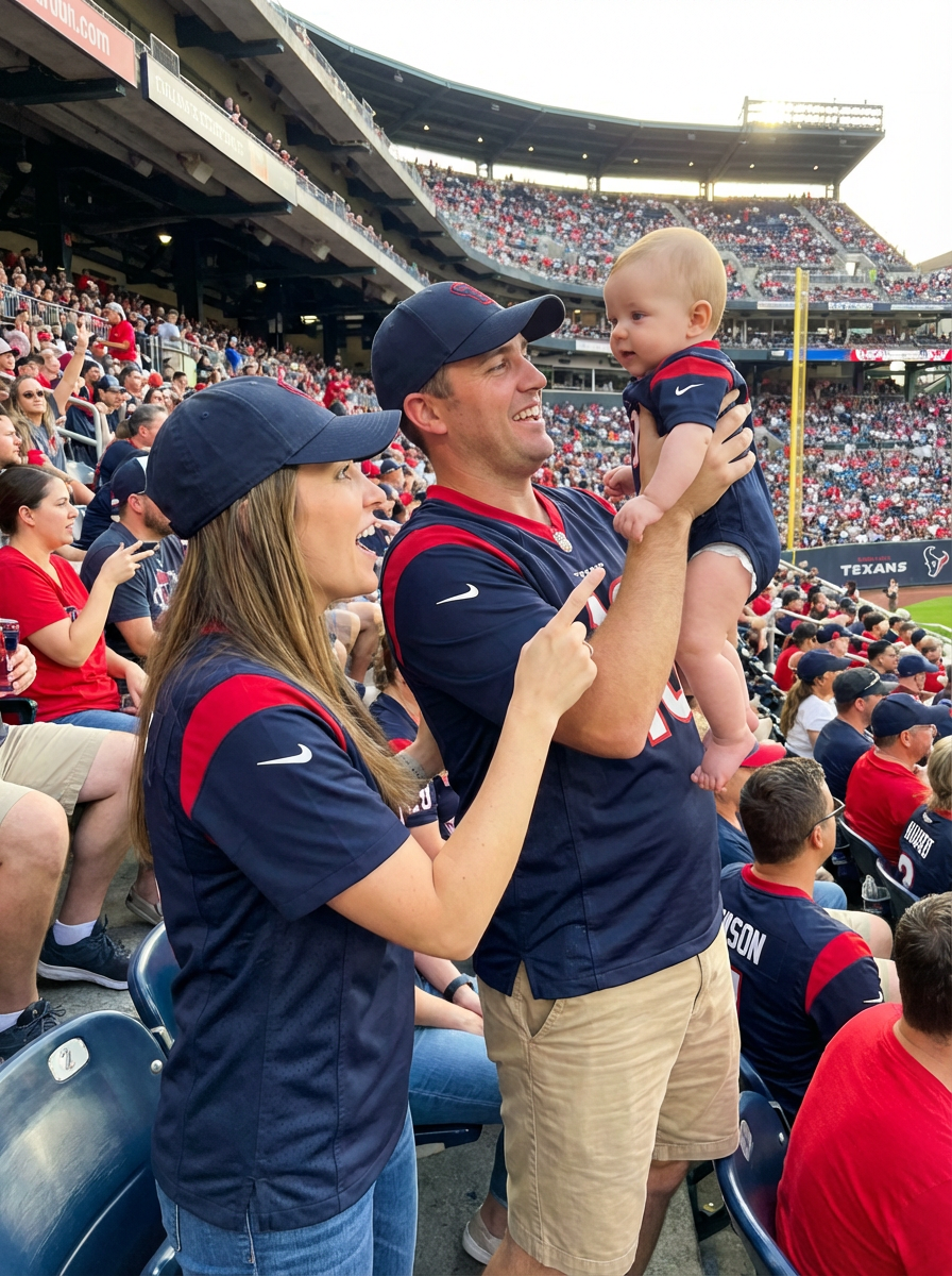 couple with baby at sports game, everyone wearing team colors, stadium background, family cheering together and teaching baby about sportsmanship, spirited family outing