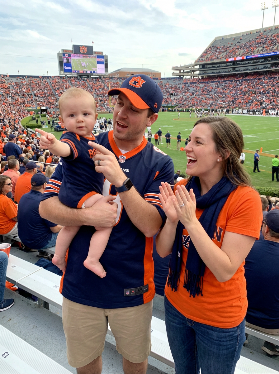 couple with baby at sports game, everyone wearing team colors, stadium background, family cheering together and teaching baby about sportsmanship, spirited family outing