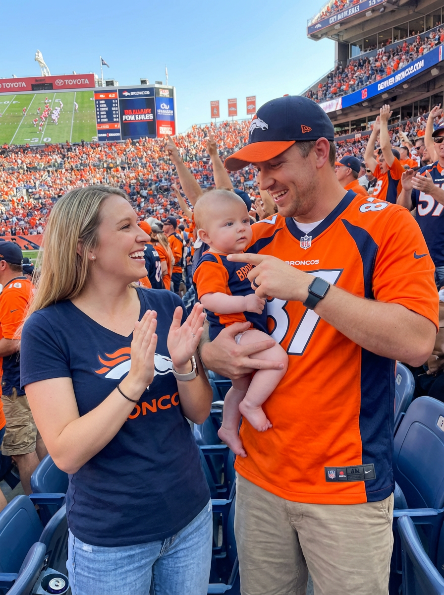 couple with baby at sports game, everyone wearing team colors, stadium background, family cheering together and teaching baby about sportsmanship, spirited family outing