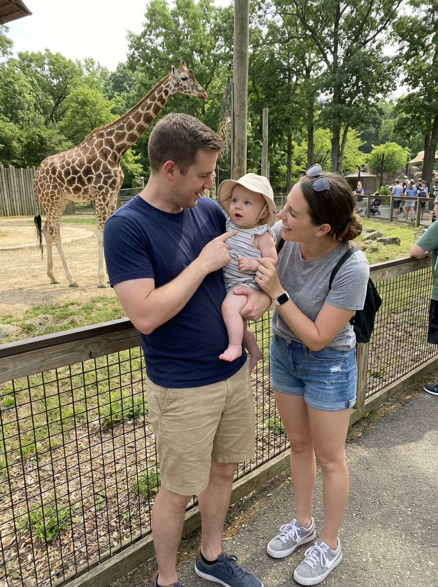 couple with baby at zoo, everyone wearing comfortable walking clothes, animal exhibits in background, parents showing animals to fascinated baby, educational family adventure