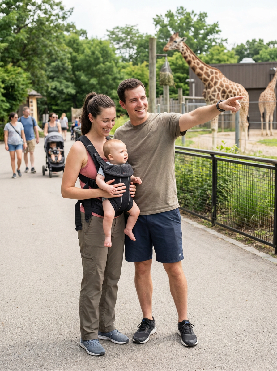 couple with baby at zoo, everyone wearing comfortable walking clothes, animal exhibits in background, parents showing animals to fascinated baby, educational family adventure