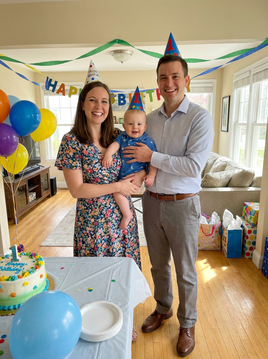 couple with baby celebrating birthday party, everyone wearing party clothes, decorations and cake visible, family celebrating with baby and creating memories, joyful family celebration