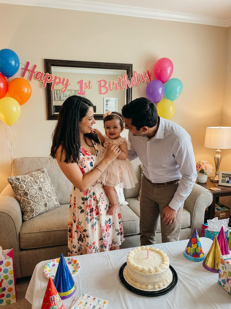 couple with baby celebrating birthday party, everyone wearing party clothes, decorations and cake visible, family celebrating with baby and creating memories, joyful family celebration