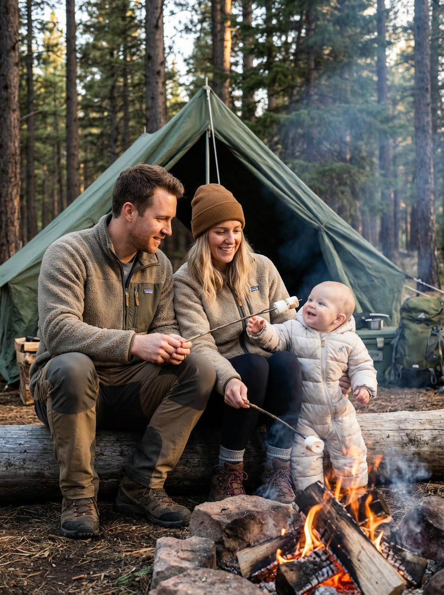 couple with baby during family camping trip, everyone wearing outdoor gear, tent and campfire in background, parents and baby roasting marshmallows together, adventurous family bonding