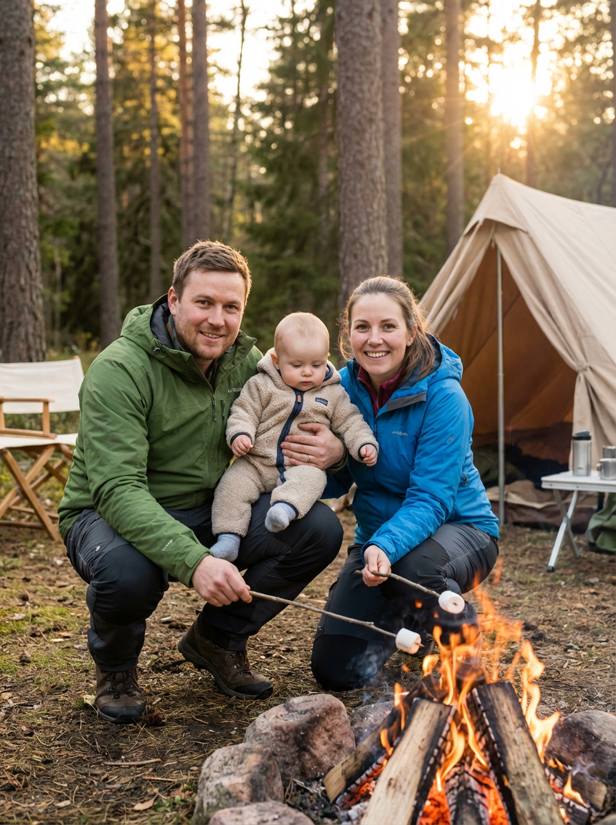 couple with baby during family camping trip, everyone wearing outdoor gear, tent and campfire in background, parents and baby roasting marshmallows together, adventurous family bonding