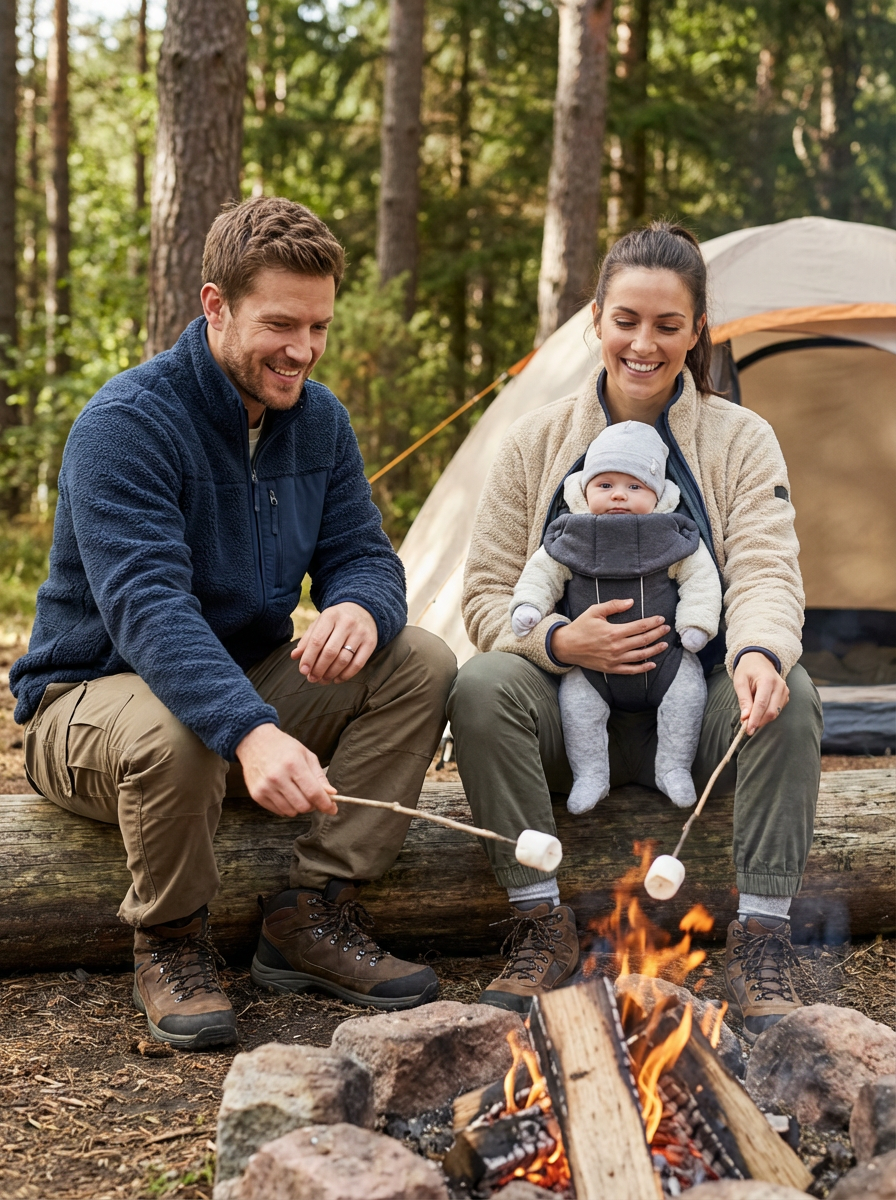 couple with baby during family camping trip, everyone wearing outdoor gear, tent and campfire in background, parents and baby roasting marshmallows together, adventurous family bonding