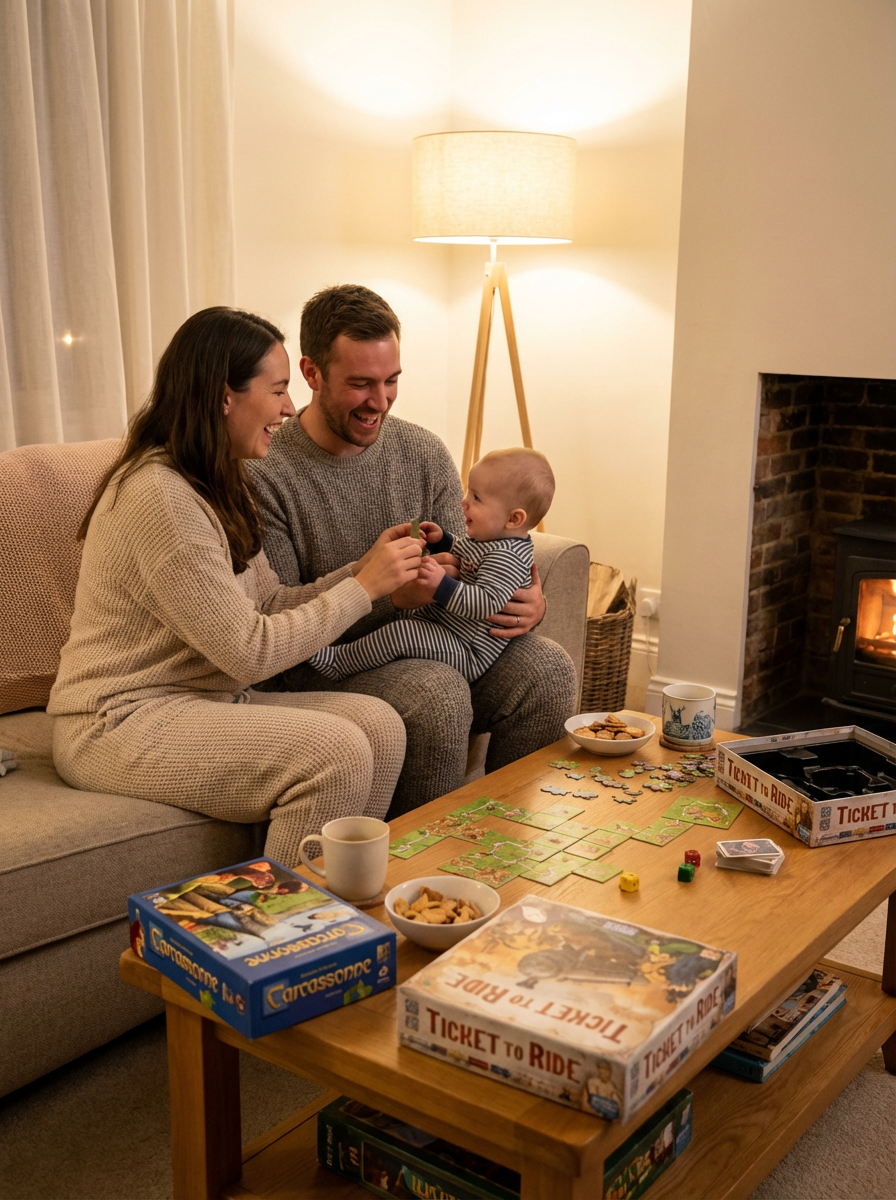 couple with baby during family game night, everyone in cozy pajamas, board games on table, parents playing with baby in living room, loving family fun