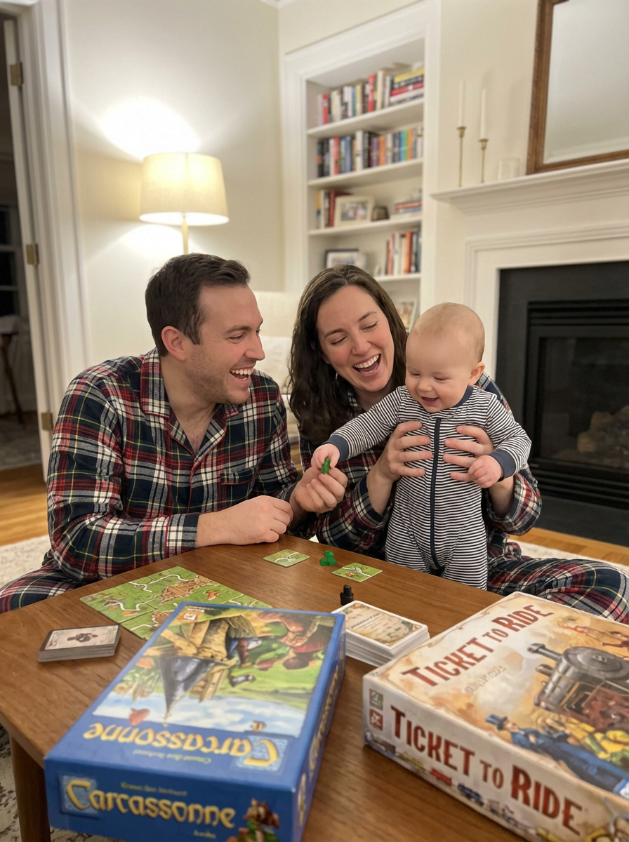couple with baby during family game night, everyone in cozy pajamas, board games on table, parents playing with baby in living room, loving family fun