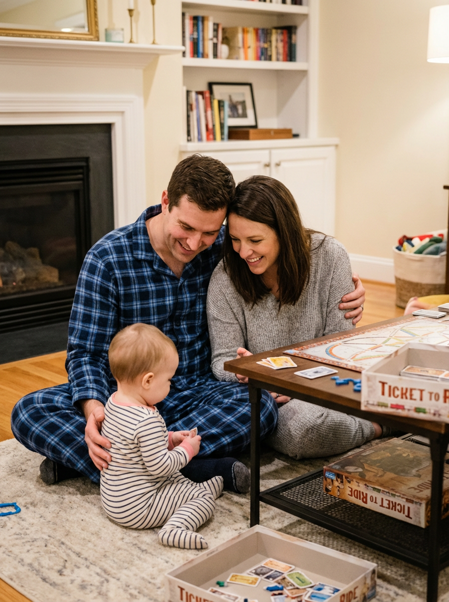 couple with baby during family game night, everyone in cozy pajamas, board games on table, parents playing with baby in living room, loving family fun