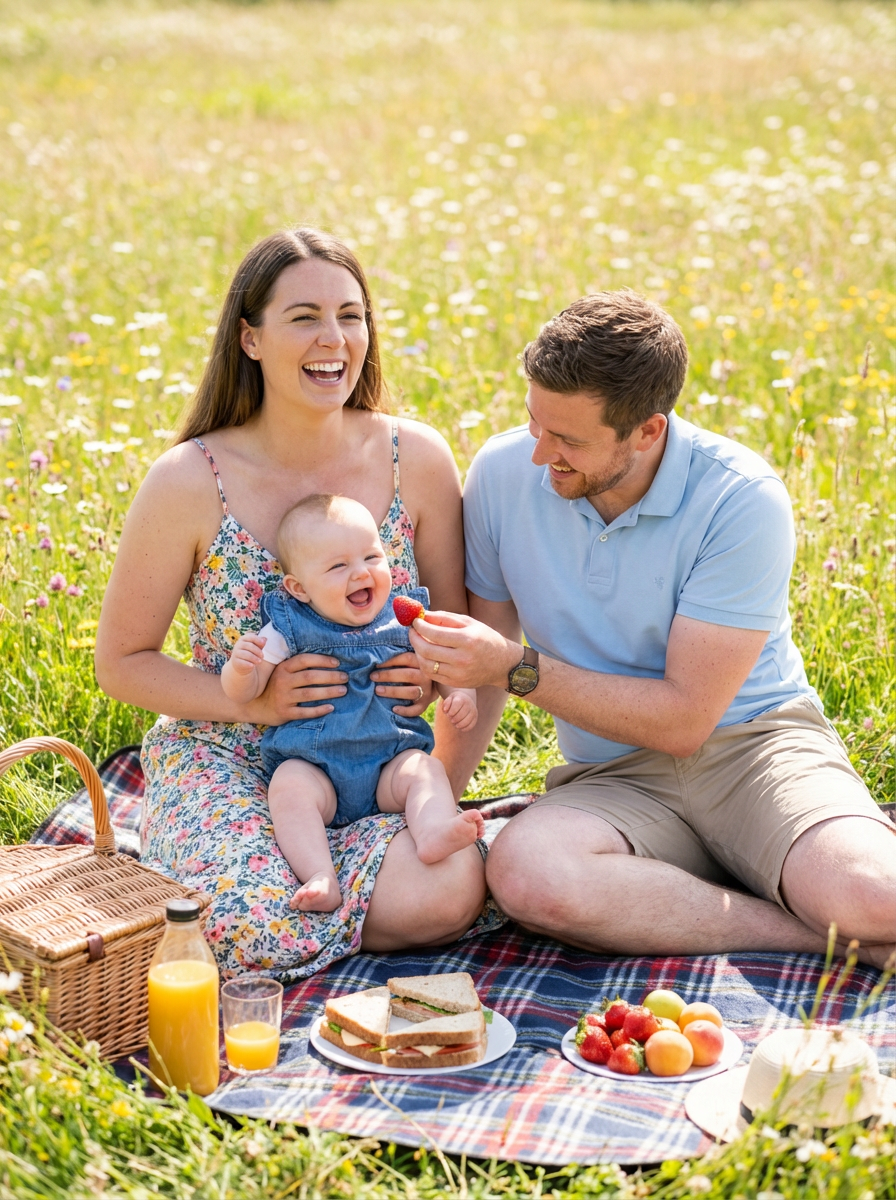 couple with baby having picnic in meadow, everyone wearing casual spring outfits, bright natural lighting, blanket spread with family enjoying lunch together, laughing and bonding