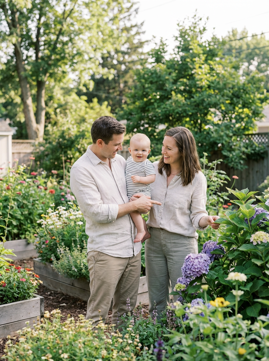 couple with baby in backyard garden, everyone wearing light casual clothing, natural daylight, parents showing baby plants and flowers, nurturing family activity