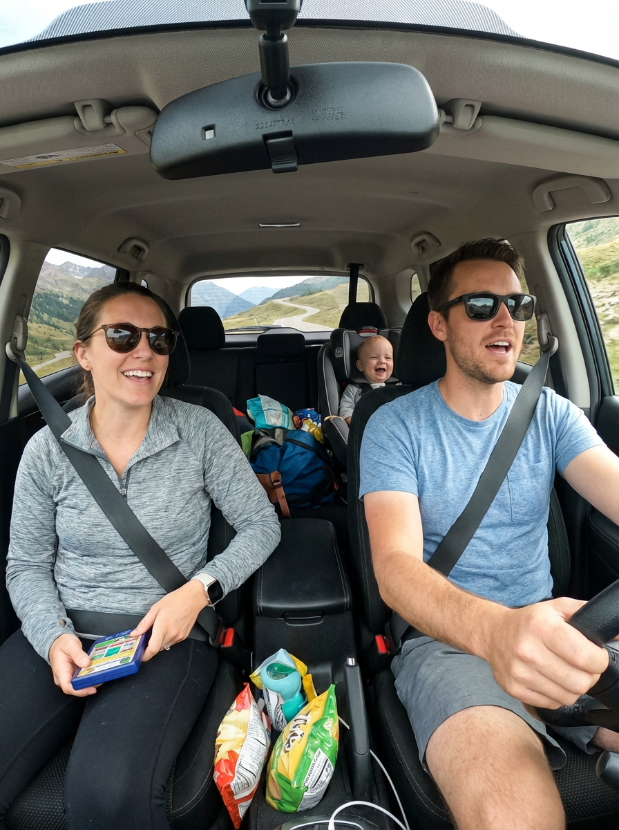 couple with baby in car during road trip, everyone wearing travel clothes, scenic landscape through windows, family singing songs and playing travel games, bonding journey