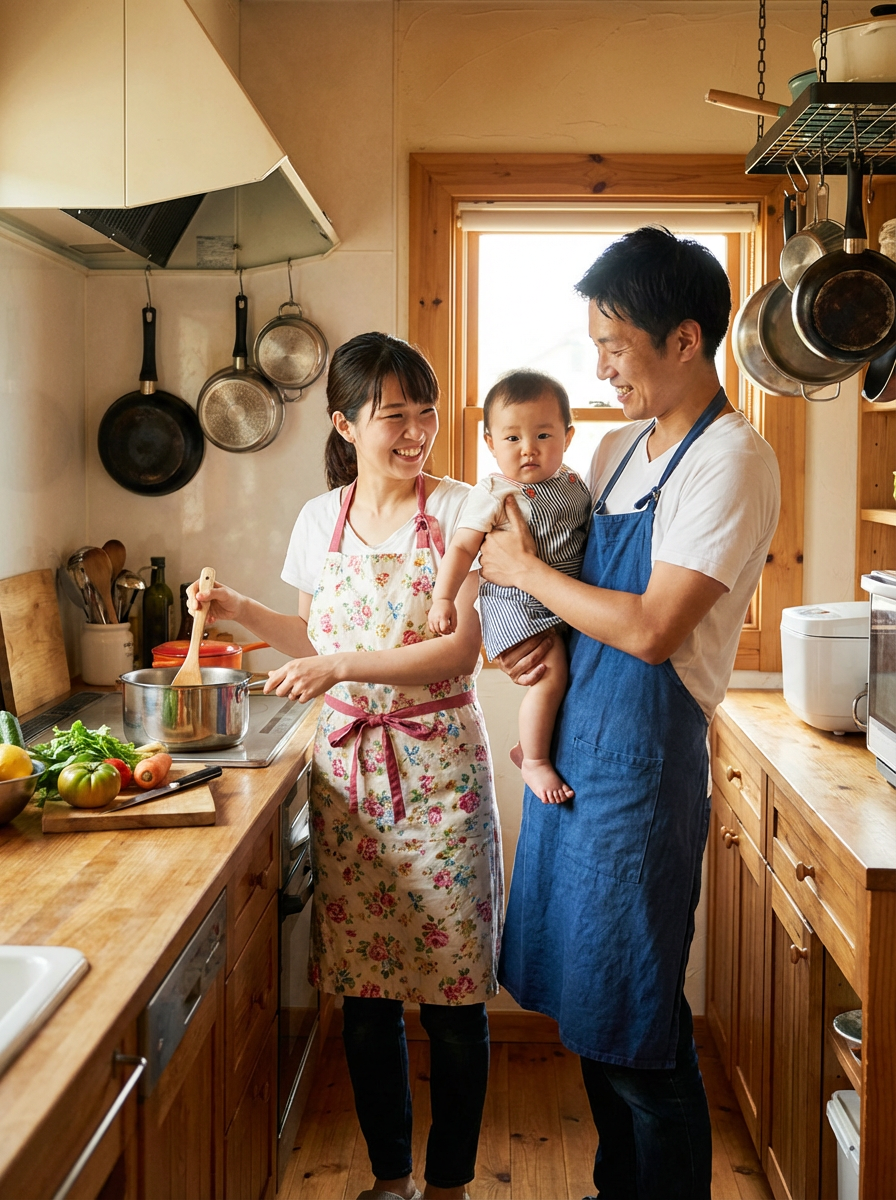 couple with baby in kitchen, everyone wearing aprons, warm indoor lighting, parents holding baby while cooking, domestic family bliss