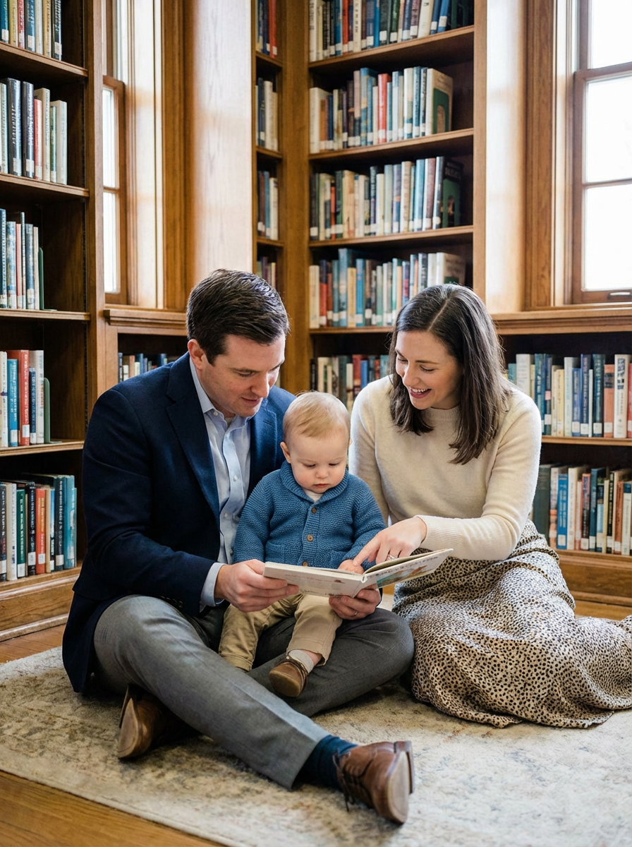 couple with baby in library, everyone wearing smart casual clothing, bookshelves in background, parents reading stories to baby, educational family time
