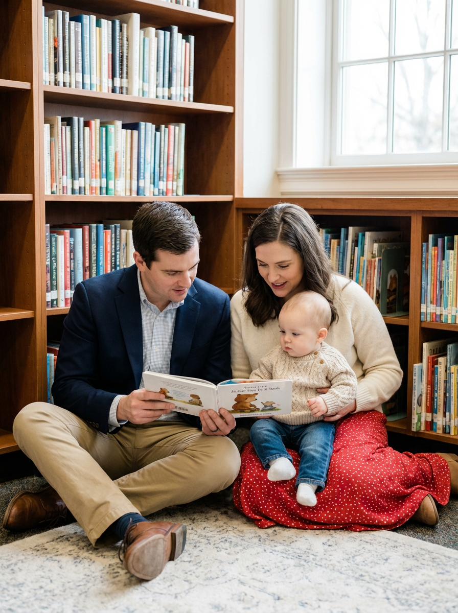 couple with baby in library, everyone wearing smart casual clothing, bookshelves in background, parents reading stories to baby, educational family time