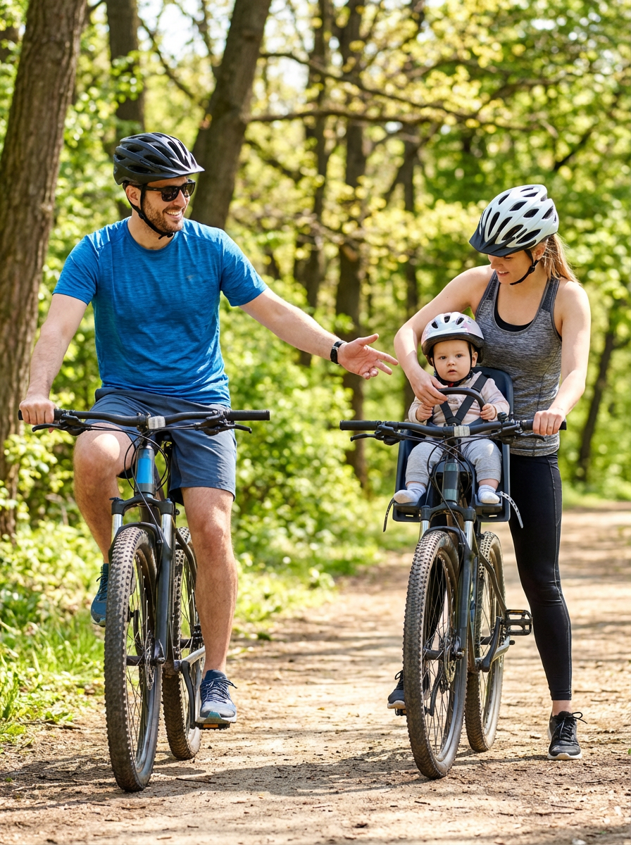couple with baby on family bike ride, everyone wearing helmets and athletic wear, park trail background, parents teaching baby to ride bikes, active healthy family lifestyle