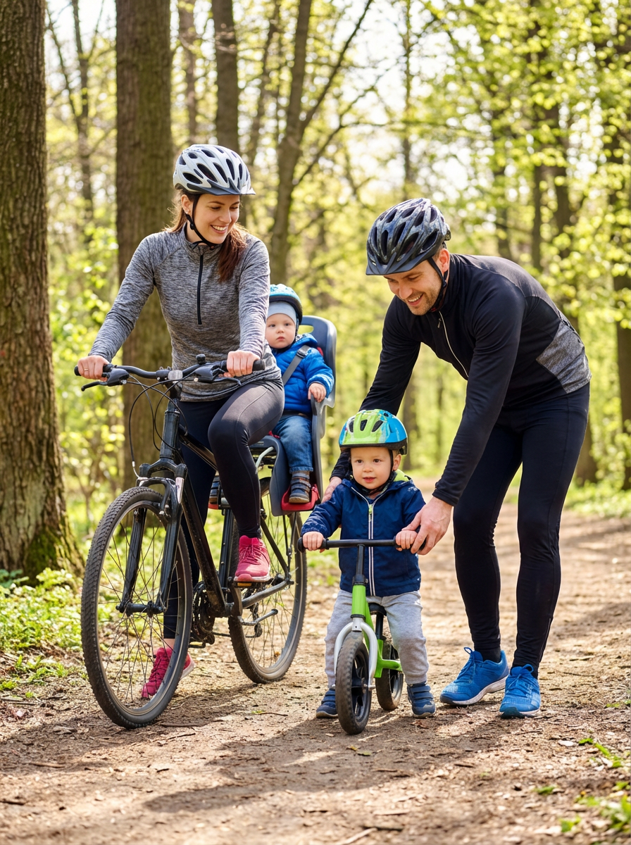 couple with baby on family bike ride, everyone wearing helmets and athletic wear, park trail background, parents teaching baby to ride bikes, active healthy family lifestyle