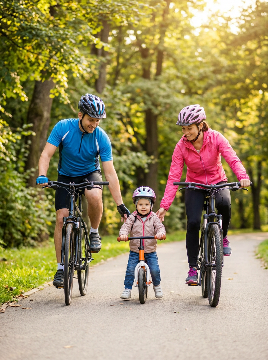 couple with baby on family bike ride, everyone wearing helmets and athletic wear, park trail background, parents teaching baby to ride bikes, active healthy family lifestyle