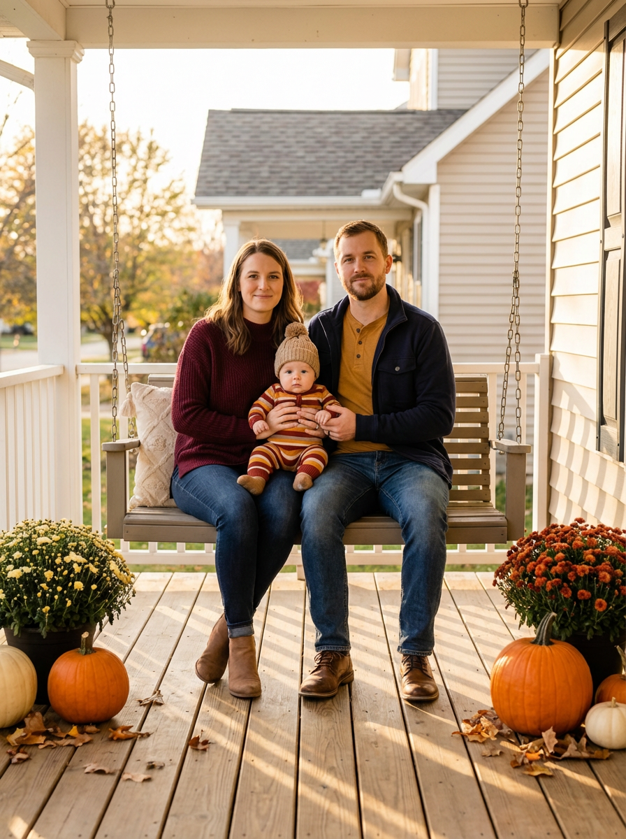 couple with baby on front porch, everyone wearing coordinated autumn colors, soft afternoon lighting, parents sitting with baby on porch swing, peaceful family portrait