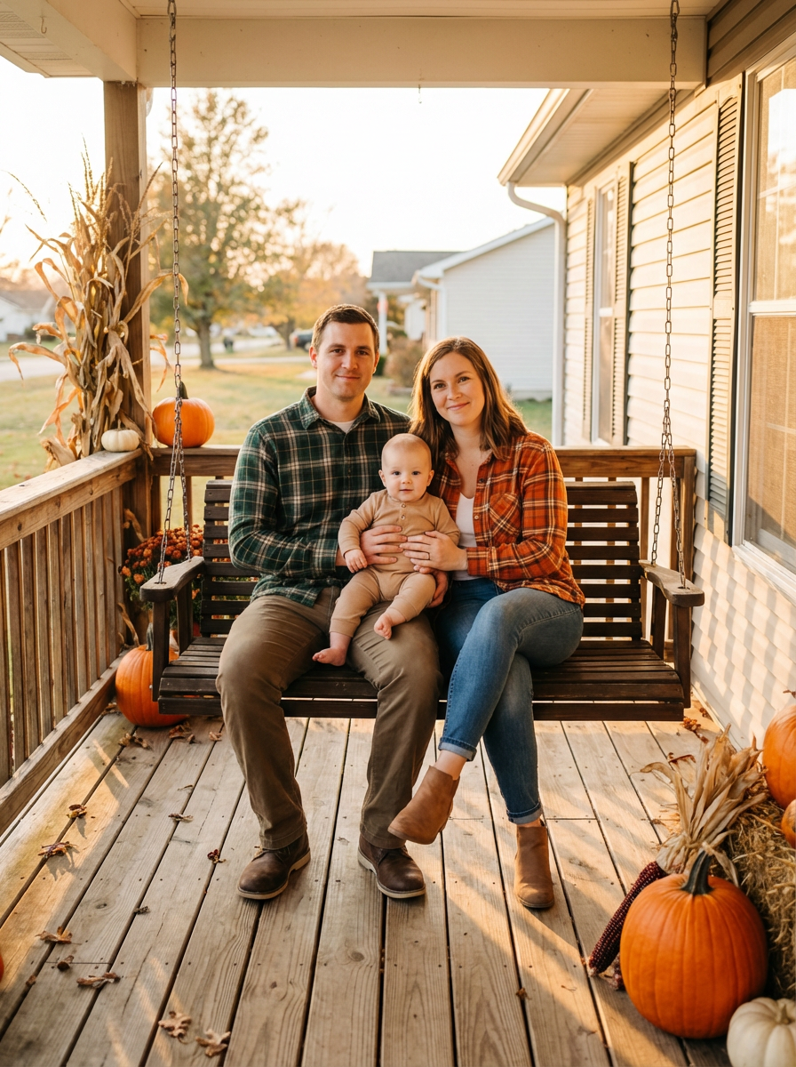 couple with baby on front porch, everyone wearing coordinated autumn colors, soft afternoon lighting, parents sitting with baby on porch swing, peaceful family portrait
