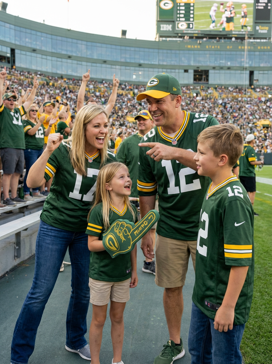 couple with children at sports game, everyone wearing team colors, stadium background, family cheering together and teaching kids about sportsmanship, spirited family outing