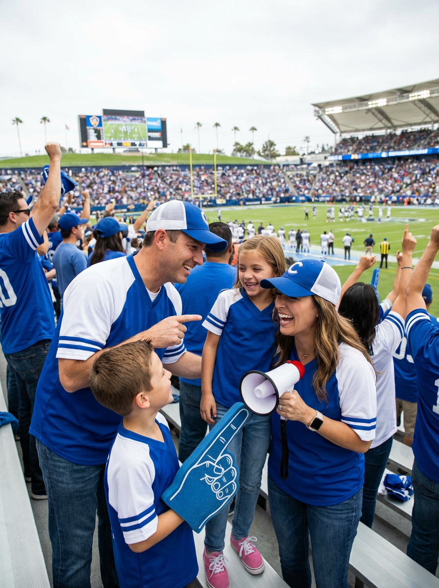 couple with children at sports game, everyone wearing team colors, stadium background, family cheering together and teaching kids about sportsmanship, spirited family outing