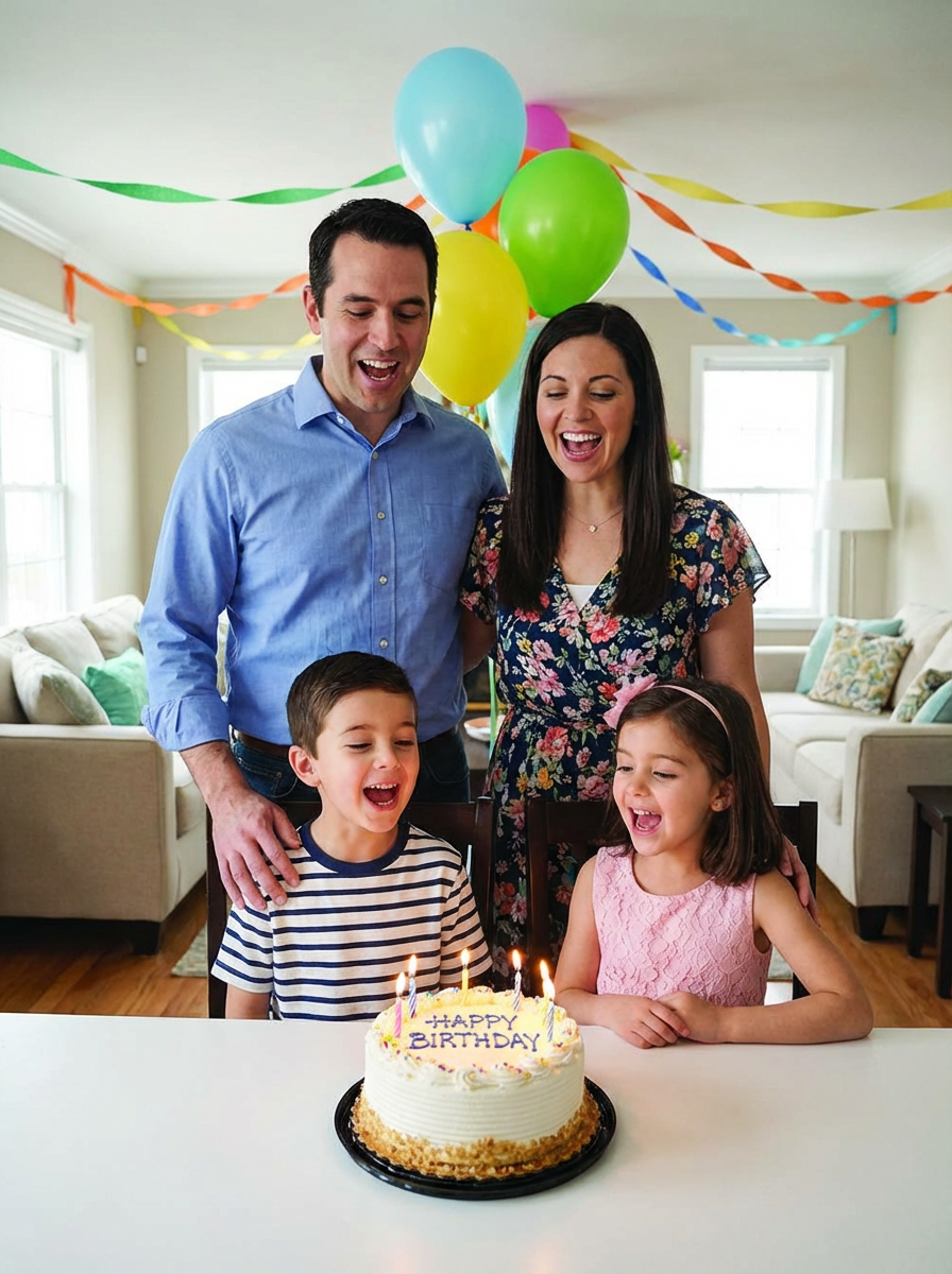 couple with children celebrating birthday party, everyone wearing party clothes, decorations and cake visible, family singing happy birthday and creating memories, joyful family celebration