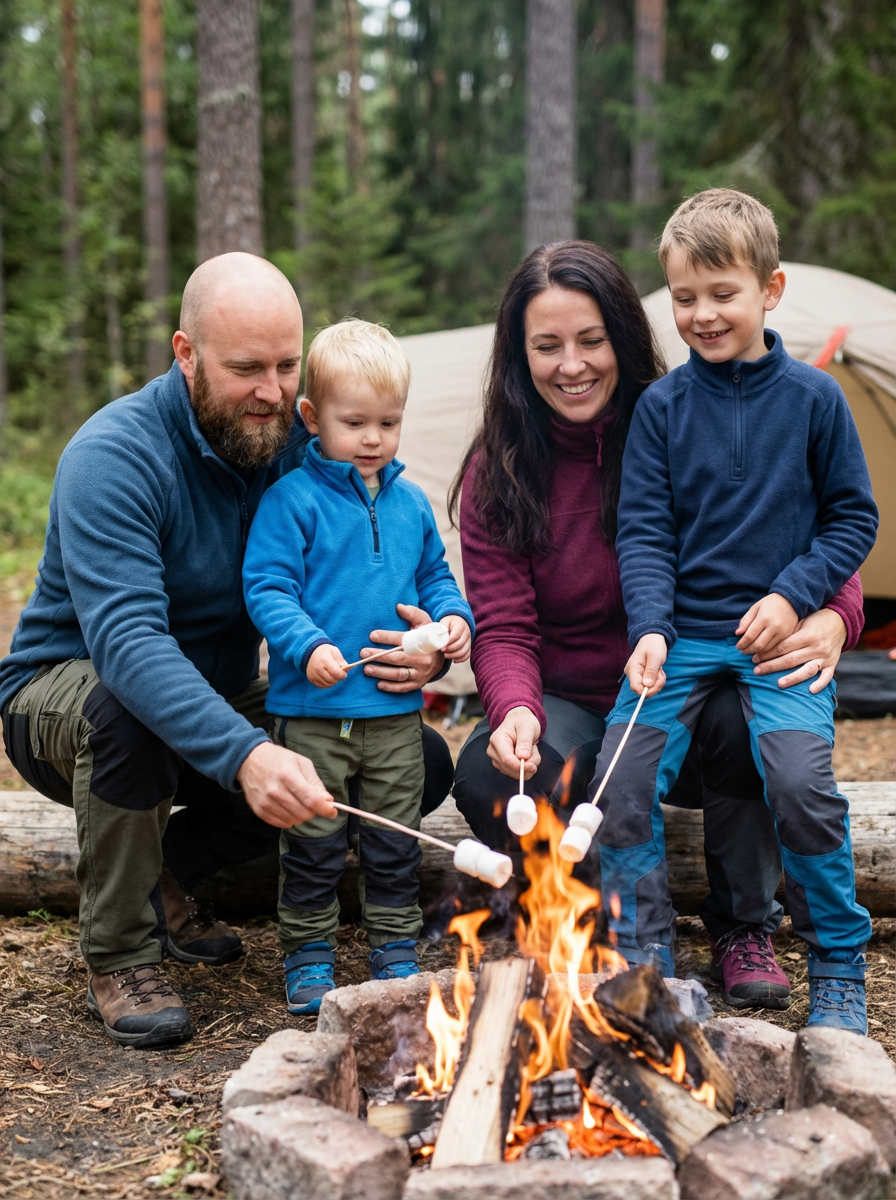 couple with children during family camping trip, everyone wearing outdoor gear, tent and campfire in background, parents and kids roasting marshmallows together, adventurous family bonding