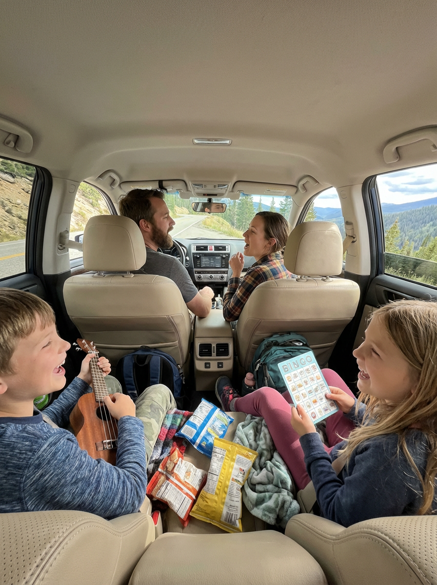 couple with children in car during road trip, everyone wearing travel clothes, scenic landscape through windows, family singing songs and playing travel games, bonding journey