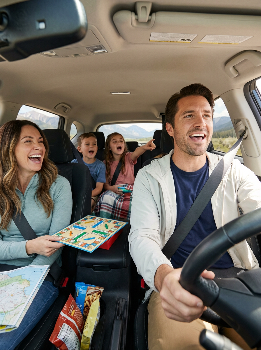 couple with children in car during road trip, everyone wearing travel clothes, scenic landscape through windows, family singing songs and playing travel games, bonding journey