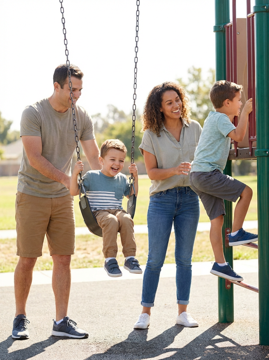 couple with energetic kids at playground, everyone wearing comfortable play clothes, bright sunny day, parents pushing children on swings and watching them play, active family fun
