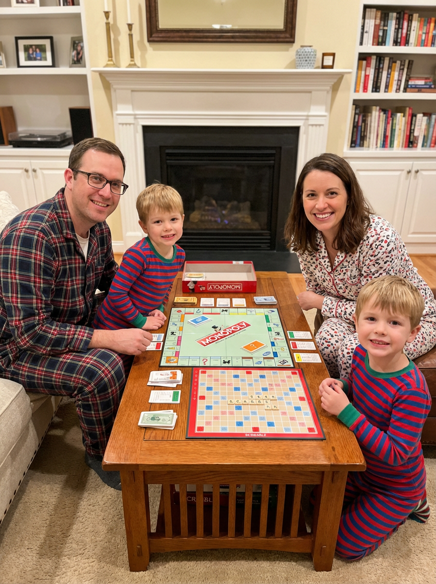 couple with kids during family game night, everyone in cozy pajamas, board games on table, parents and children playing together in living room, competitive but loving family fun