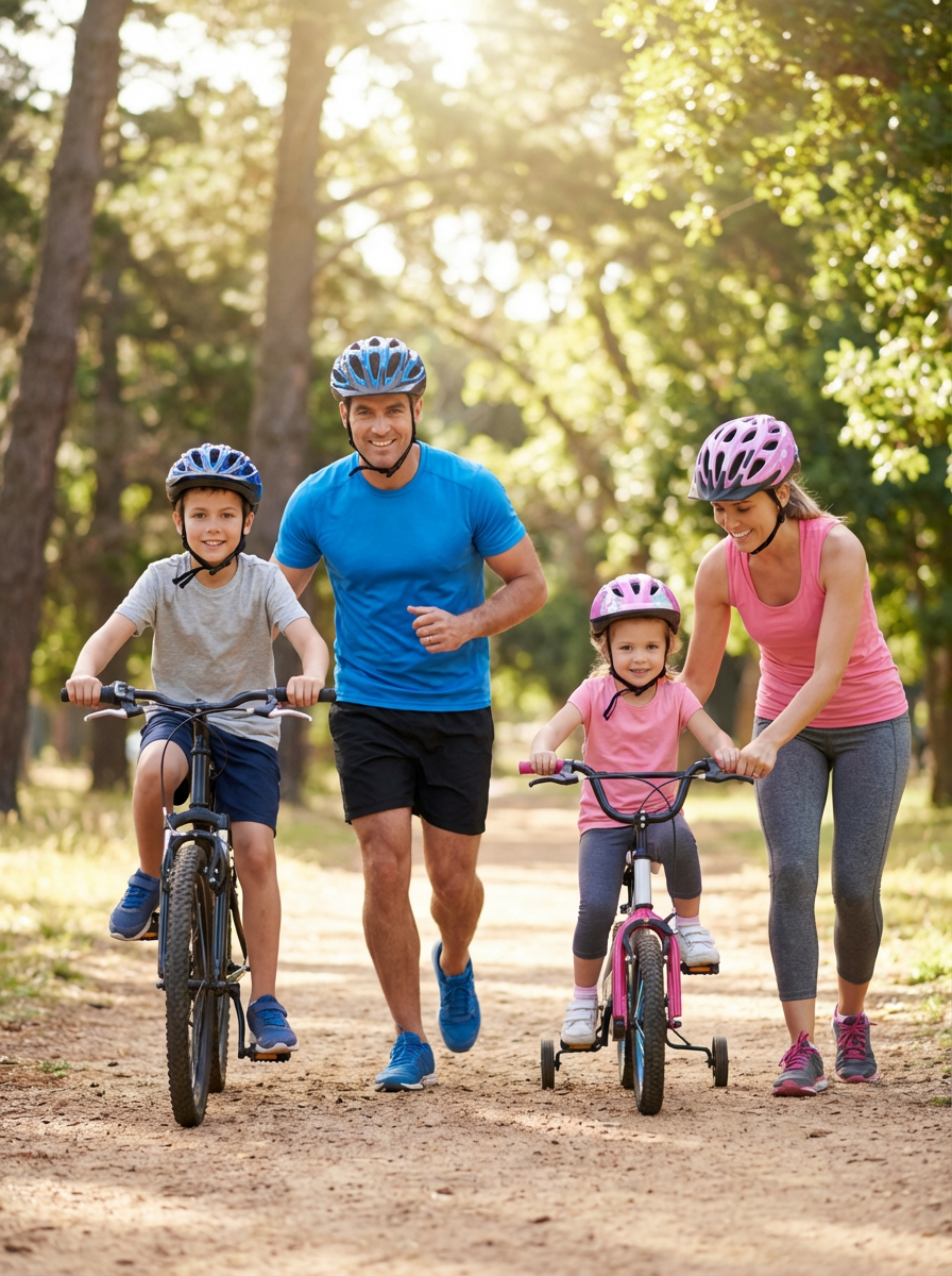 couple with kids on family bike ride, everyone wearing helmets and athletic wear, park trail background, parents teaching children to ride bikes, active healthy family lifestyle