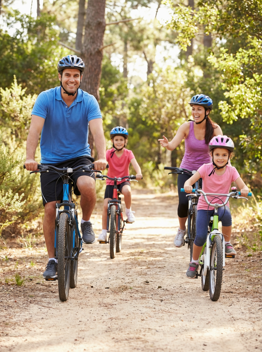 couple with kids on family bike ride, everyone wearing helmets and athletic wear, park trail background, parents teaching children to ride bikes, active healthy family lifestyle