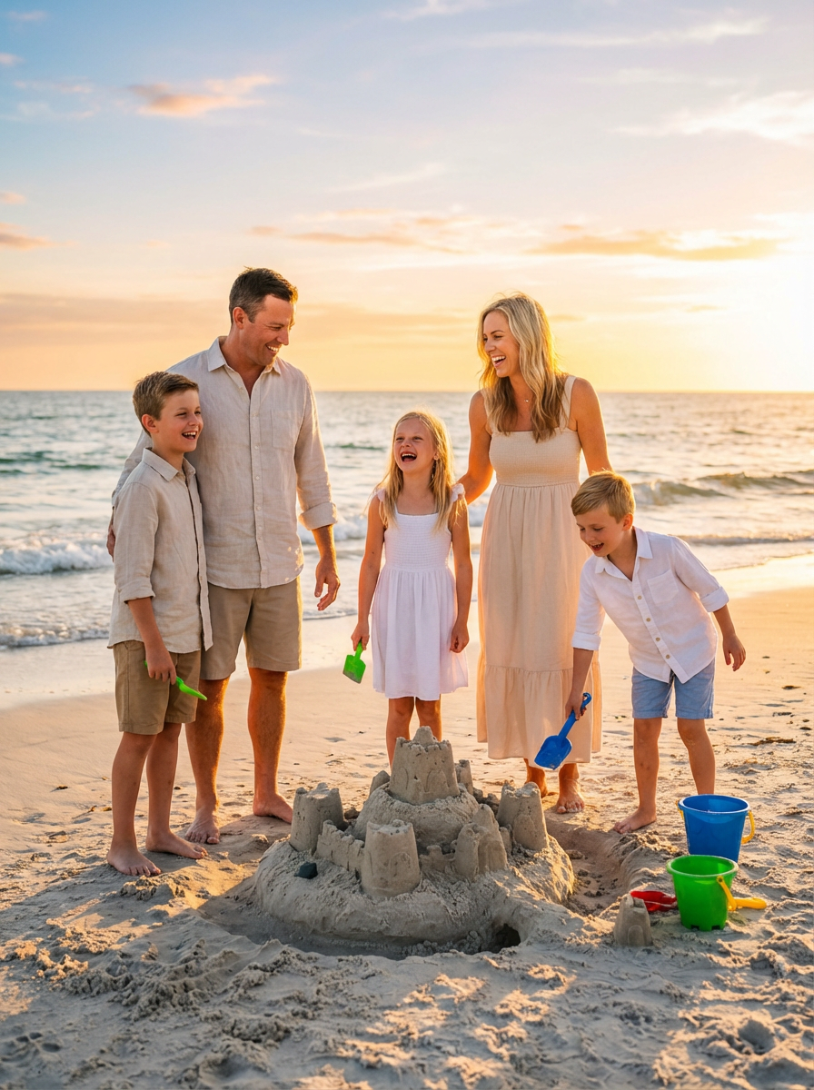 couple with three kids at beach during sunset, everyone wearing light summer clothing, golden hour lighting, ocean waves in background, parents and children building sandcastles together, joyful family moment