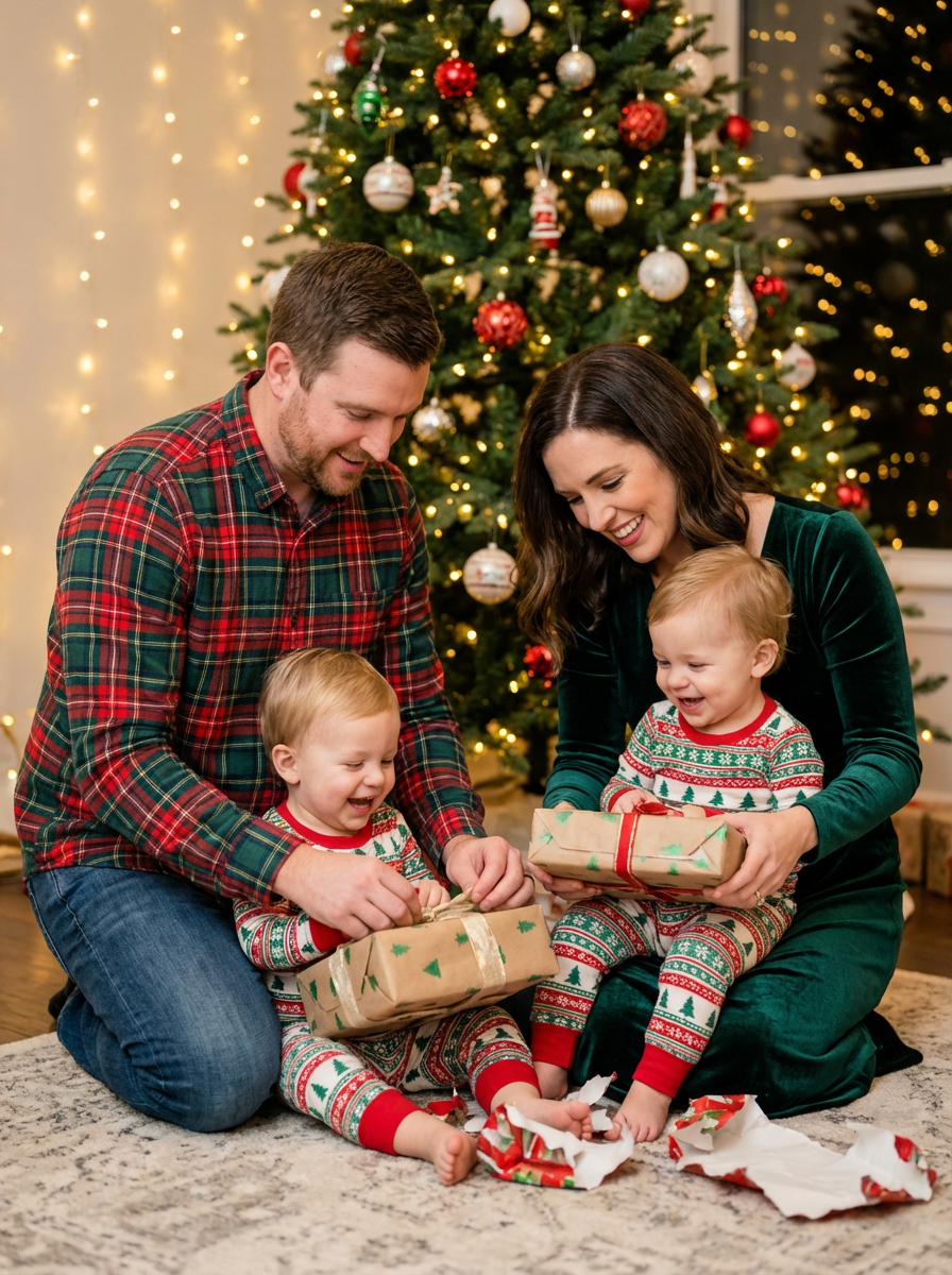 couple with twin toddlers in front of Christmas tree, everyone wearing festive colors, twinkling lights background, parents kneeling with children opening presents, warm holiday family scene