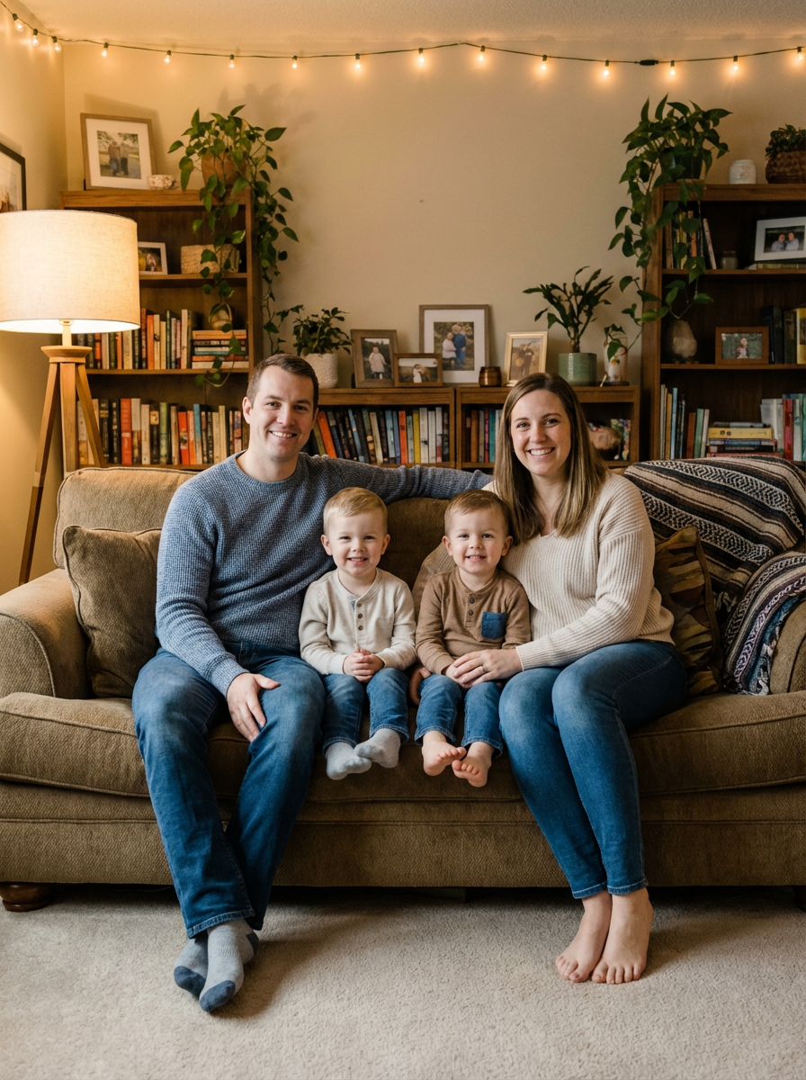 couple with two young children in living room setting, everyone wearing coordinated casual outfits, warm lighting, cozy home atmosphere, sitting together on sofa with kids between parents, genuine family smiles