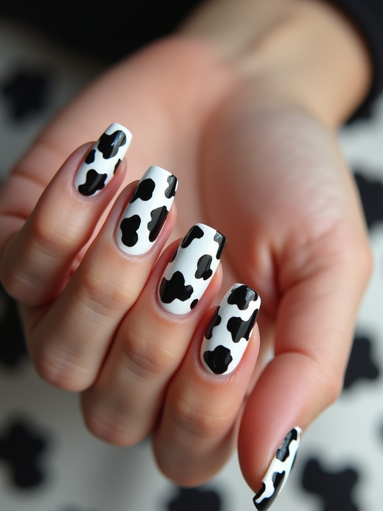 cow print nails on glossy white base, bold and playful aesthetic, beauty studio lighting, fashion-forward hand styling