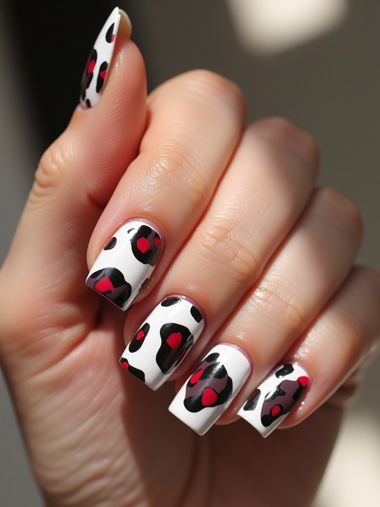 cow print nails on glossy white base, bold and playful aesthetic, beauty studio lighting, fashion-forward hand styling