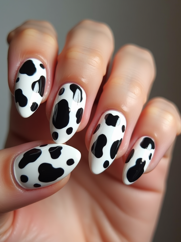 cow print nails on glossy white base, bold and playful aesthetic, beauty studio lighting, fashion-forward hand styling