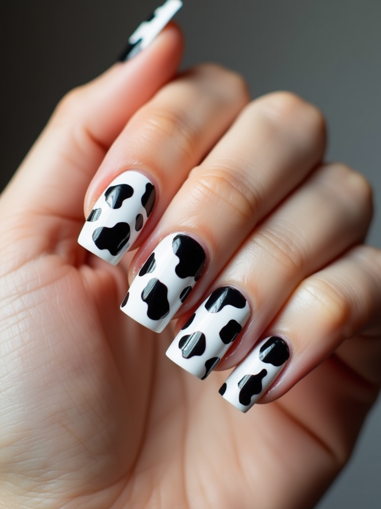 cow print nails on glossy white base, bold and playful aesthetic, beauty studio lighting, fashion-forward hand styling