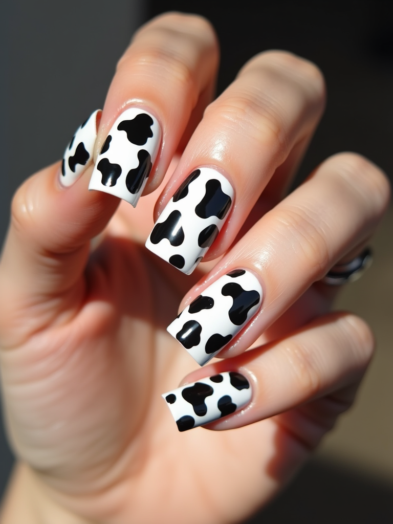 cow print nails on glossy white base, bold and playful aesthetic, beauty studio lighting, fashion-forward hand styling