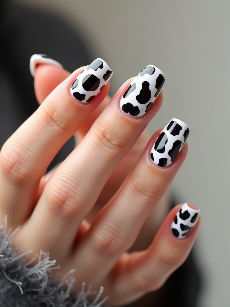 cow print nails on glossy white base, bold and playful aesthetic, beauty studio lighting, fashion-forward hand styling