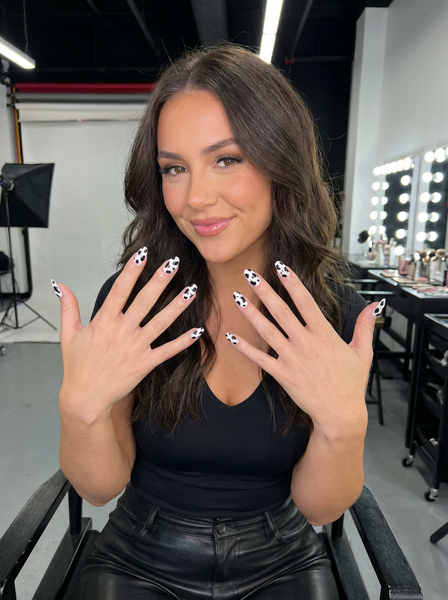 cow print nails on glossy white base, bold and playful aesthetic, beauty studio lighting, fashion-forward hand styling