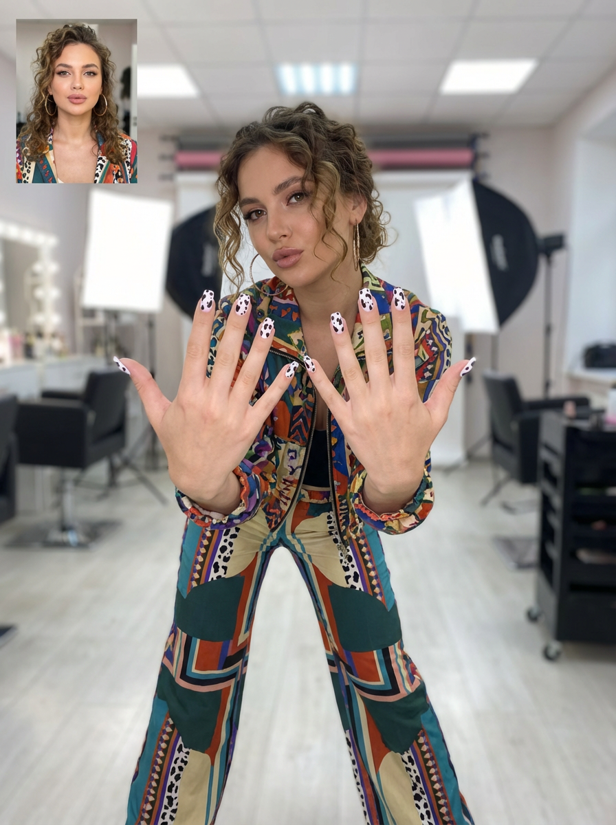 cow print nails on glossy white base, bold and playful aesthetic, beauty studio lighting, fashion-forward hand styling