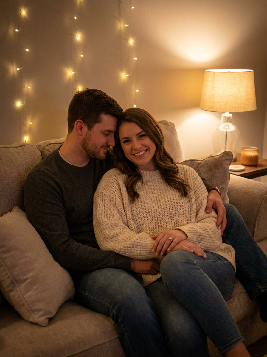 Cozy and intimate engagement photoshoot at home. Model wearing a comfortable oversized sweater . Cuddling on the couch, warm and intimate lighting.