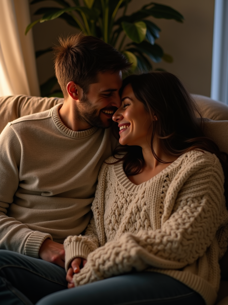 Cozy and intimate engagement photoshoot at home. Wearing a comfortable oversized sweater . Cuddling on the couch, warm and intimate lighting.