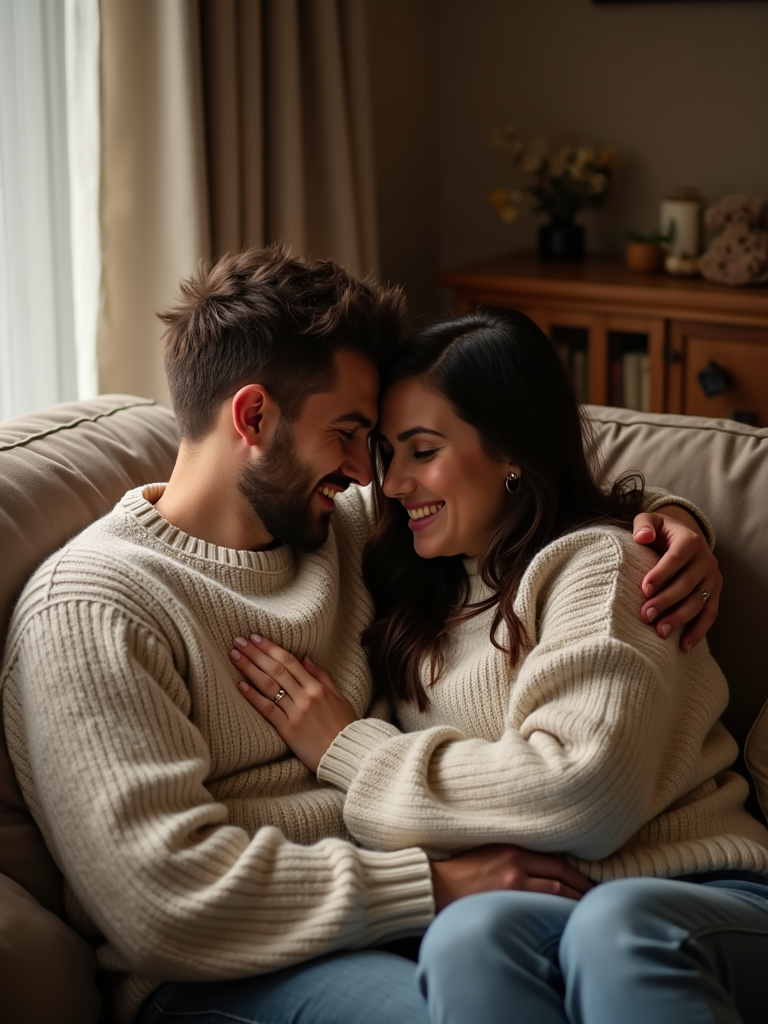 Cozy and intimate engagement photoshoot at home. Wearing a comfortable oversized sweater . Cuddling on the couch, warm and intimate lighting.